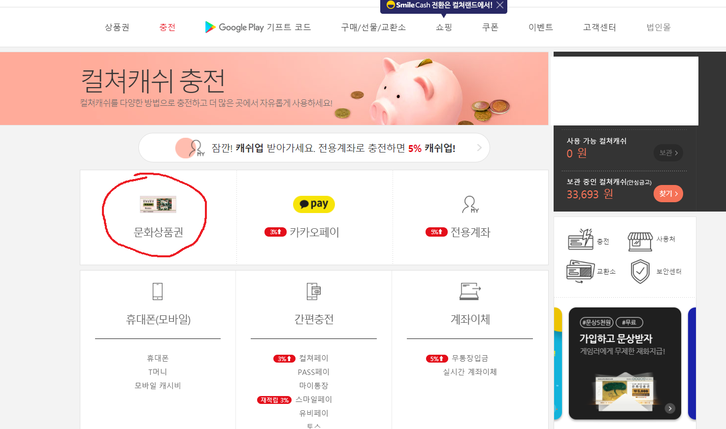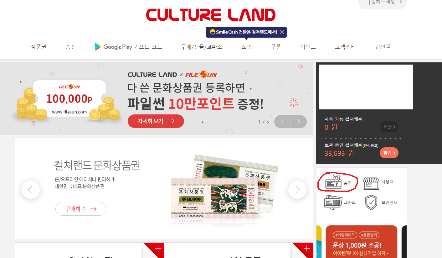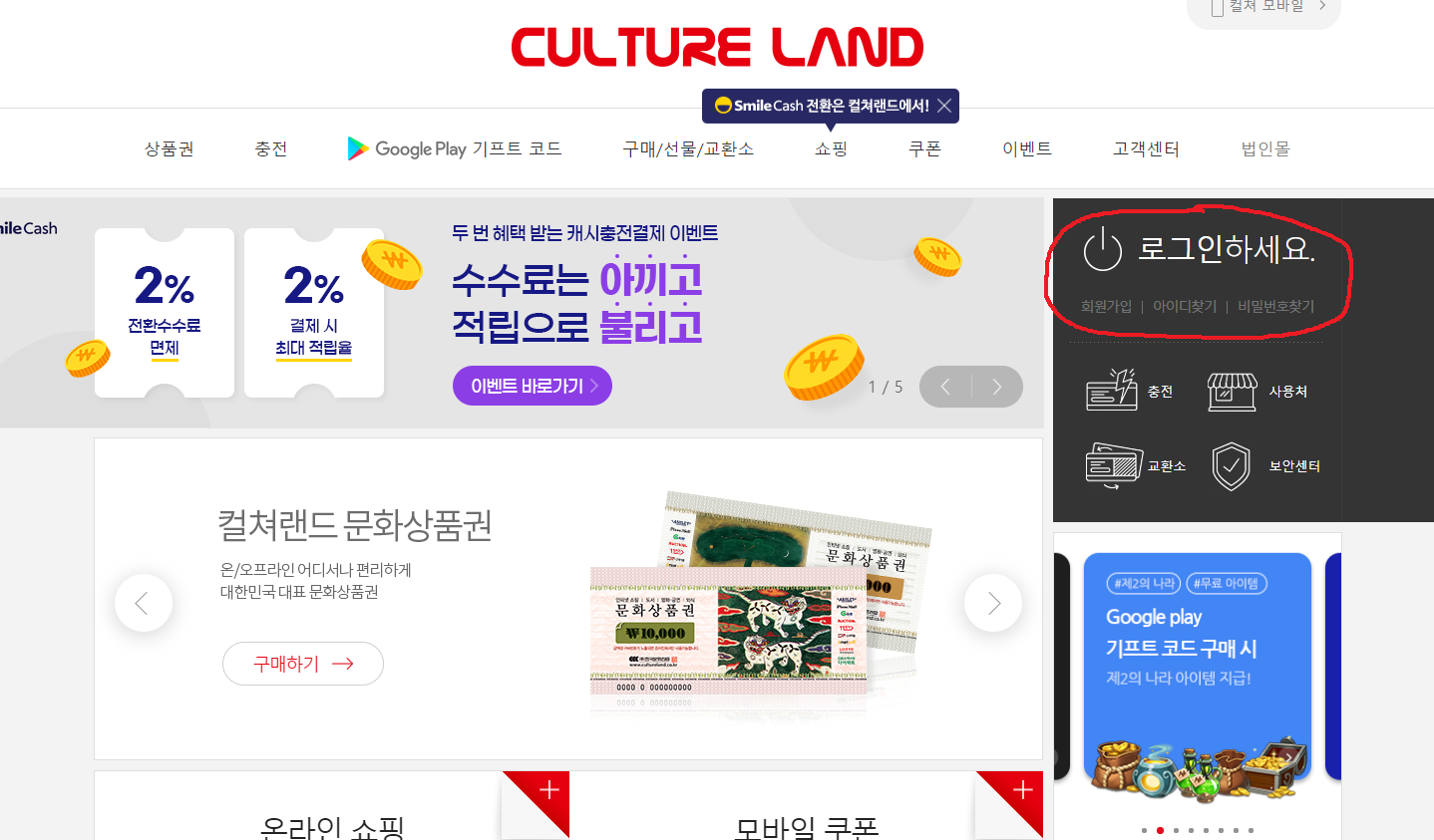 되어 있으면 컬쳐랜드 어플로 충전하는게